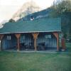 - the moderately pitched gabled roof with exposed rafters and log slab siding for the walls;