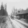 - the division of the site into zones of activity, including the cleared area east of the mill pond, containing a collection of garages, sheds and log dumps associated with the mill’s logging operations, the main sawmill and its outbuildings at the northwest part of the site, the village-like cluster of residential and administrative buildings at the southern part of the site, and the shipping area at the westernmost part of the site, containing the rail line and related structures;