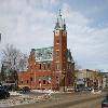 - the modest classical ornamentation, including a metal modillioned cornice partially encircling the roofline, second-storey stacked bands of horizontal brick intermittently placed, round arch windows with limestone sills, brick voussoirs and wooden frames, etc.