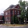 - its masonry detailing, including a projecting, bevelled base course, brick courses at window-sill level at the spring of the arches, at the second-storey floor line and under the eaves, quoined, brick corner-piers, raised, brick borders around openings and hammered-stone keystones, springer voussoirs and window sills;