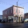 - brick facade featuring brick Romanesque architraves with sandstone keystones around door and window openings, brick and sandstone stringcourses above first storey, and rusticated sandstone stringcourse above foundation;