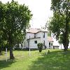 - the single-storey nearly-square massing under a truncated pyramidal roof, with the front enhanced by a modest gable-roofed porch centred between small gable dormers