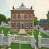 - pedimented dormers and elaborate parapet of the south and east facades with banisters, plinths, and paired pilasters