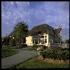 - elevated, circular waiting room window bay on the east end, topped with a coronet type of crenulations