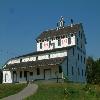 The original building was rectangular, measuring 32' by 46' 8”, and made of planks. The additions on either end were built at a later date. It is a two-storey plank structure with a gable roof, built in typical nineteenth century Regency Gothic style. One of the main features of the building is the roof framing. This king post roof truss was the nineteenth century version of the modern prefabricated truss. The king post roof truss relies upon the principal rafters of the roof, acting as a simple arch to support the king post. The principal rafter traps the head of the post. Struts or braces prop the principals and carry the load from the purlins to the foot of the post. Therefore, the king post is loaded at the front and supported at the head. The wall framing has corner and intermediate posts, 12” X 12” and 12” X 8”, respectively. There are diagonal braces on both the end and side walls. The usual joint between the post and bottom chord was a strap iron clamp fitted around the chord with the end bolted to the bottom of the king post. This strap was omitted here and replaced by a two-pin mortise and tenon joint. Although the outer windows have been covered, there is evidence on the interior of large Regency Gothic windows. There is also evidence on the west end of the roof structure that suggests a tower was located here, quite likely completely incorporated into the building.