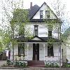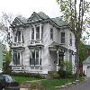 - original window and door elements, including: lancet windows containing stained glass, outlined by stone and topped by segmented Gothic arches, extending into cross gables projecting through the eaves; and west window and baptistery containing stained glass lined in stone tracery.