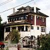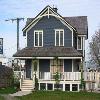 - Exterior details including wooden drop-siding and the remaining windows which are wooden sash gothic arched windows with coloured leaded glass