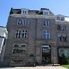 - la façade aménagée sur un pan coupé à 45 degrés, marquée par une tourelle d'angle saillante, évidée aux étages pour former des balcons aux garde-corps ouvragés, et coiffée d'une toiture conique couverte d'ardoise posée « à la canadienne » et avec motifs en forme d'écailles de poisson;