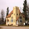 - les matériaux et les finis modestes, y compris le plafond fait de lambris de bois composite finis naturellement, les murs en contreplaqué teintés de couleur pâle et les bancs en bois, l'estrade avec lutrin et autre ameublement assorti, etc.
