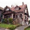 - characteristics of the Craftsman-style bungalow, including half-timbered gables with pebble-dashed stucco, shallow cross-gabled bays on either side, slate roof, overhanging eaves, stone piers with matching wall masonry, upper sleeping porch with balustrade, tall chimneys from concrete block, and wraparound verandah with pergola on the southern exposure, square chamfered posts, and balustrade